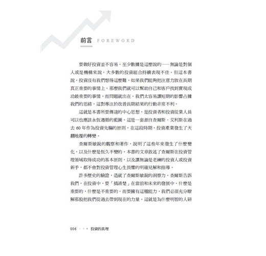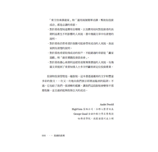 《投資的真理》將是機構投資人和散戶投資者都不能錯過的資源,這本書將在投資組合經理人、這產業的愛好者以及對金融投資世界感興趣的人的書架上,佔有一席之地。