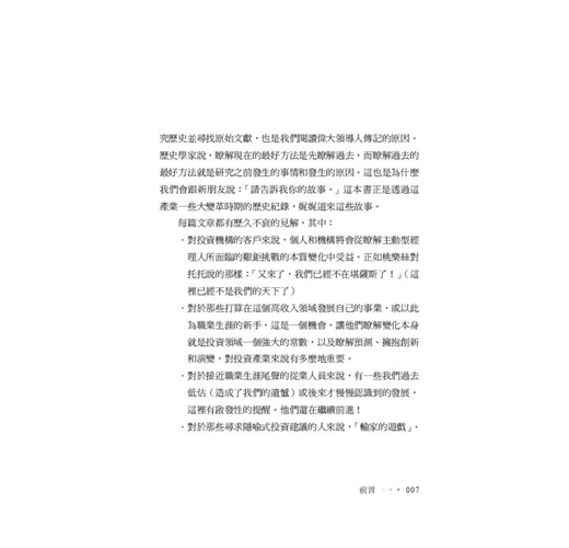作者探討了過去六十年來活躍於投資界的一些重大爭議,從績效投資的興衰、債券是否適合長期投資者、典型投資組合中流動性過剩的相關成本問題,以及如何辨別成功、高績效投資公司的特徵。