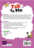 Talk to Me 系列共分為三冊,此書為第二冊。希望讓國小階段的學習者,經由大量的對話練習,逐步發展英語口說技能。每冊有 16 個單元,將多元、富有創意的主題,融入生活情境、假想情境和經典故事,幫助學生培養用英語溝通的能力與自信。本系列讓學生能夠以兩人活動、小組活動或全班活動的方式,增加跟同學們練習開口說英語的機會。每單元與書末附有趣味活動,例如賓果、桌遊等,讓學生能在輕鬆有趣的情境下運用英文。透過由淺入深的學習任務和單元主題,引導學生進行有趣的對話,並學習新的單字和句型,增進其英文實力。