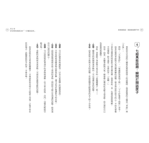 交談對象千百種,不同的個性、情境與話題常使人慌了手腳,應對失策。為了讓你不再因人際困擾,臼井老師親授與任何人都能開心聊的「7組萬能話題」,以及溫暖回話、交談不冷場的「3招神回應」。