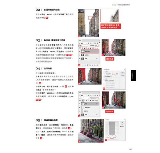 ▌範例精緻多元,包括:風景、靜物、人像、動物、建築、……等,並附贈完整的範例素材、範例製作完成的 psd 圖層檔案,方便一邊閱讀一邊練習。
