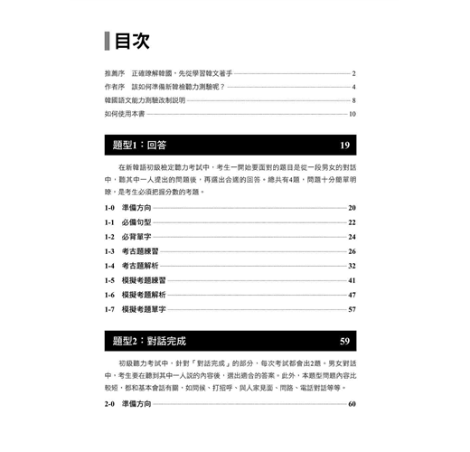 本書收錄了初級韓語檢定範圍設定的2000個單字及相應的文法,至於考古題則提供具體且實際的準備方向。尤其本書嚴選並整理了公開考古題中的單字與文法,讓考生們先熟悉考古題的文法與單字,並透過考古題更了解考試,再將所學到的內容運用在模擬試題上解題,藉此確定是否有確實地理解前面所學習的內容。聽力的基礎即文句的結構,也就是文法與單字。希望考生們能夠熟悉反覆出現在每個單元的單字,並完全消化吸收成為自己的實力。即使考生們學韓語的最終目標只是希望能夠與韓國人流暢的對話,或是能聽懂連續劇及綜藝節目的內容,本書所提供的初級聽力訓練仍是學習韓語必經的階段。