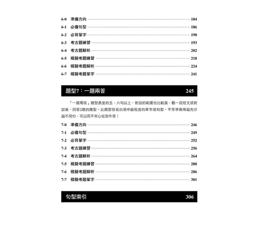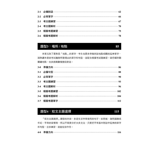 統整出應試該題型應準備並熟記之文法句型,並附上相關例句,一網打盡考題中可能出現的對話及文章,準備考試事半功倍。