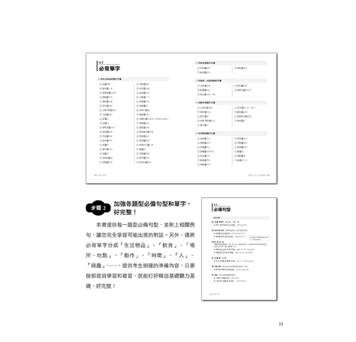 本書將每一題型之必考句型和單字分門別類,提供考生明確的準備內容,只要按部就班學習和複習,就能紮實打好韓語聽力基礎!