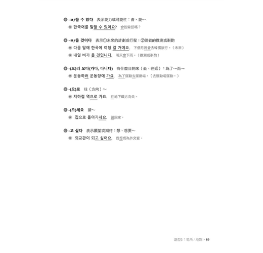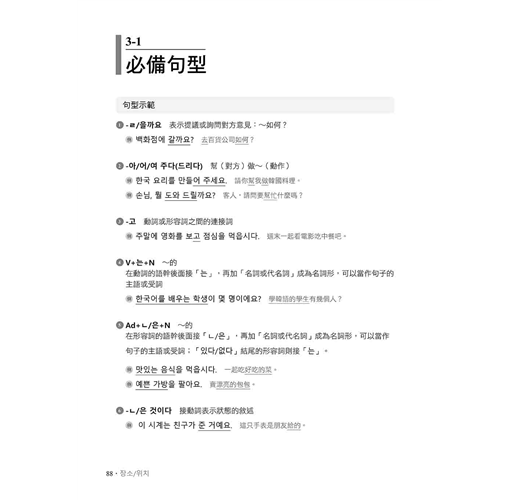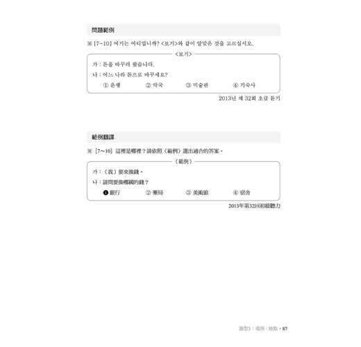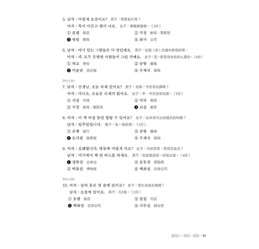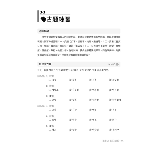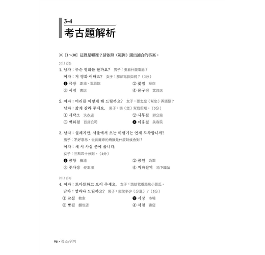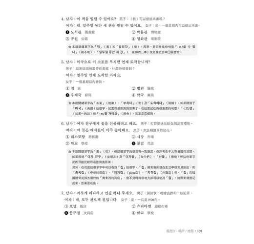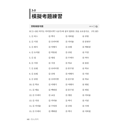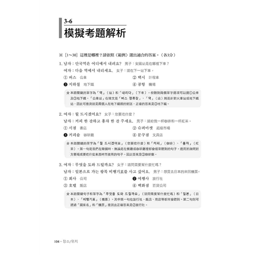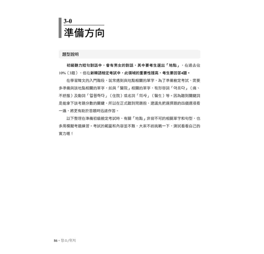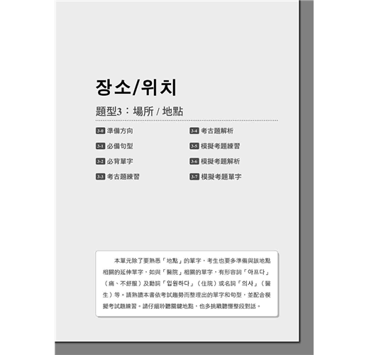 本單元除了要熟悉「地點」的單字,考生也要多準備與該地點相關的延伸單字,如與「醫院」相關的單字,有形容詞「아프다」(痛、不舒服)及動詞「입원하다」(住院)或名詞「의사」(醫生)等。請熟讀本書依考試趨勢而整理出的單字和句型,並配合模擬考試題練習。請仔細聆聽關鍵地點,也多挑戰聽懂整段對話。
