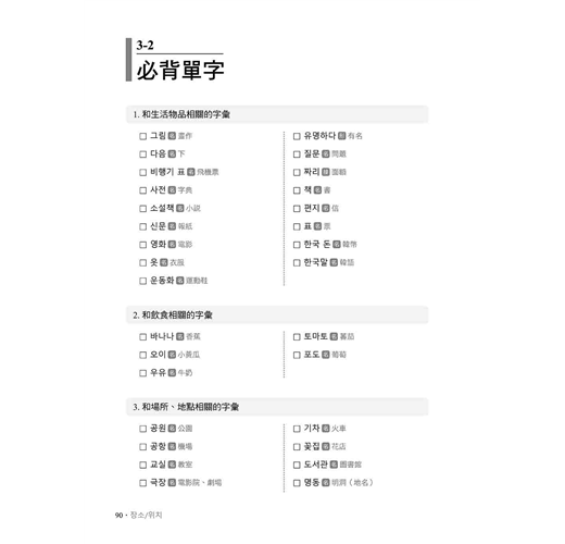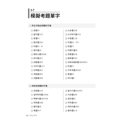 整理出該題型必考之相關單字,並依單字類型區分為「生活物品」、「飲食」、「場所 / 地點」、「動作」、「時間」、「人」等等,將必考單字完美系統化,一目了然好記憶。