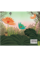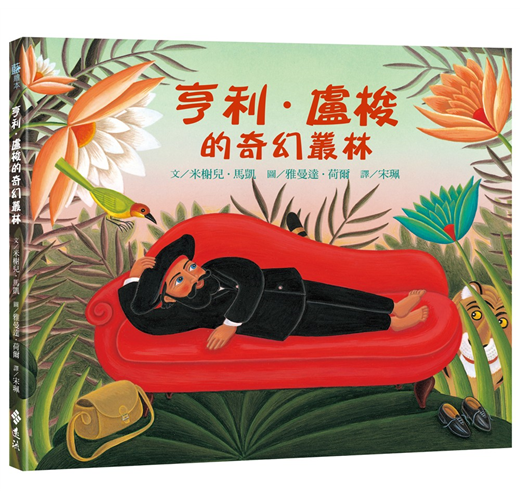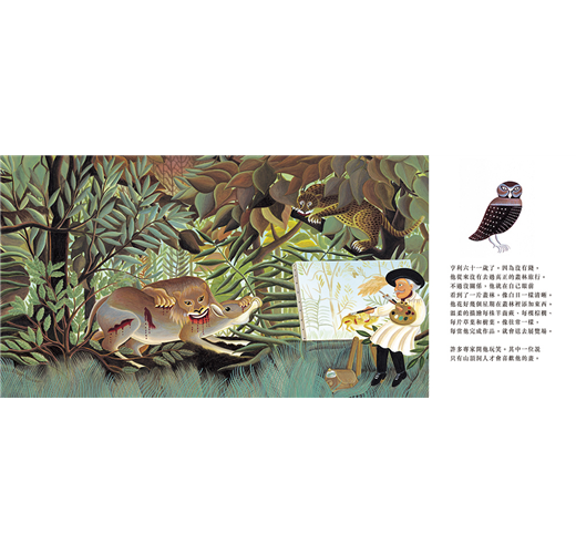 第一次看到這本圖畫書,就被書裡的圖畫深深吸引,因為畫中的色彩、線條既描繪現實事物,又刻畫一個非現實的世界,彷彿有自己的生命,在頁面上恣意伸展、擺動,跳起舞來。雖然繪者雅曼達.荷爾以亨利.盧梭的畫作為參考,把盧梭的作品巧妙安排在每一幅畫裡,卻又設法跨越時空的隔閡,使盧梭的作品看來更為可親,讓讀者自然而然的進入畫裡。