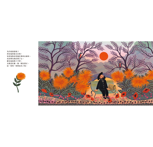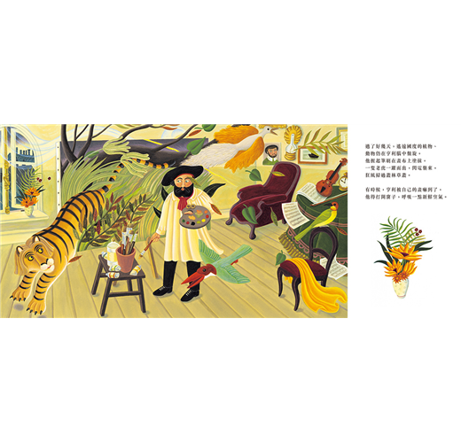 的確,這本書介紹的是一位非常特別的素人畫家,作者簡約的文字除了描述盧梭從中年自學畫畫,受專家嘲諷,仍努力不懈,終於獲得肯定外,更用充滿詩意的文字,表達盧梭的內心世界,尤其是他對大自然的熱愛,以及孩子般純真不受侷限的眼光,他所畫的不只是事物的表象,而是竭盡所能,把自己的想像、記憶和熱望都寄託在畫裡。