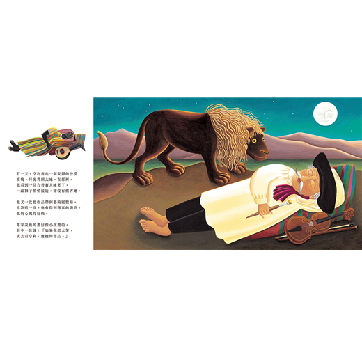 盧梭的畫像夢,沾滿童話的筆觸。這本書的畫面很神奇,好像把盧梭請到了現場,還貼心的把舞台燈光調轉成兒童的視角。構圖、色彩、光影都變得親切生動,幾乎把讀者拉進了盧梭的畫裡!文字的述敘也簡靜而有力道,把勵志的故事說得近在身邊、觸手可及。這是一本真正的「美術繪本」!文圖就像奏鳴曲般和諧,安靜而又飛揚。翻開書,我們的視覺感到愉悅,心靈受到鼓舞。同時,也在美的感動中明白:「現實」與「夢想」之間的距離,就是「力量」與「愉悅」!