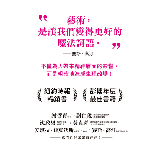 ■「藝術常常被認為是『可有可無』,但這本書表明,藝術對於美好生活來說是絕對必要的,每個人都應該讀這本書。在其中,你將學習如何恢復創造力、治癒身體、舒緩心靈,並改變你周遭的環境。」