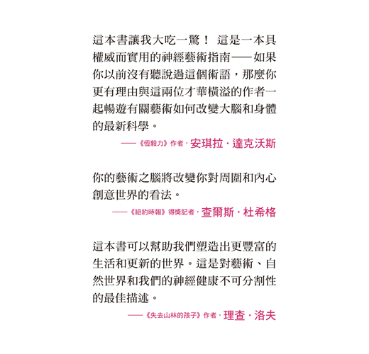 ■「這本書讓我大吃一驚! 這是一本具權威而實用的神經藝術指南——如果你以前沒有聽說過這個術語,那麼你更有理由與這兩位才華橫溢的作者一起暢遊有關藝術如何改變大腦和身體的最新科學。」