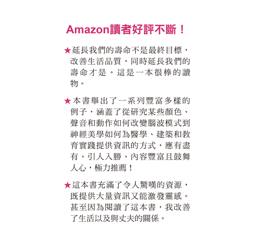 ■「本書舉出了一系列豐富多樣的例子,涵蓋了從研究某些顏色、聲音和動作如何改變腦波模式到神經美學如何為醫學、建築和教育實踐提供資訊的方式,應有盡有。引人入勝、內容豐富且鼓舞人心,極力推薦!」