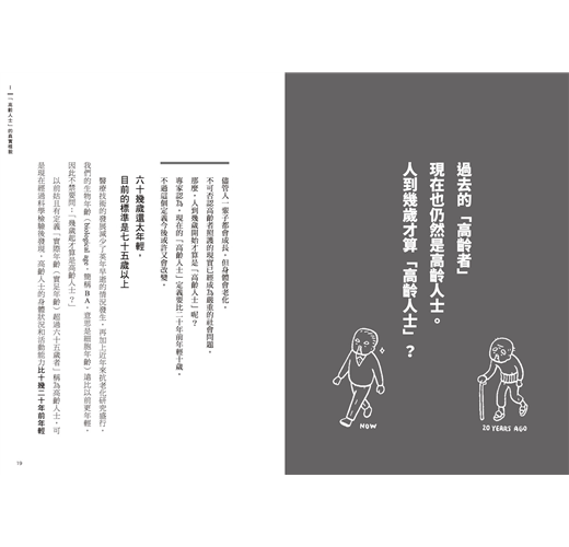 你知道我們的主觀年齡通常低於實足年齡嗎?現在對於「高齡人士」的定義要比二十年前年輕十歲。六十幾歲還太年輕,目前的標準是七十五歲以上。