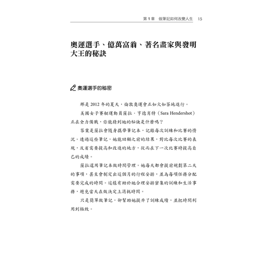 不管奧運選手、億萬富翁、著名畫家,還是發明大王,都離不開做筆記,做筆記彷彿打開了他們的想法,讓他們記住更多的東西,思考得更加深入,輸出更多成果,幫他們成為各個領域首屈一指的行業領袖。