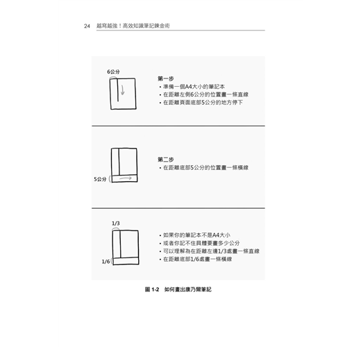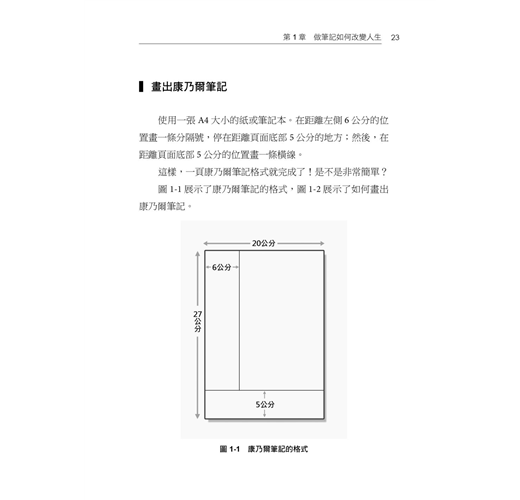 這樣,一頁康乃爾筆記格式就完成了!是不是非常簡單?圖1-1 展示了康乃爾筆記的格式,圖1-2 展示了如何畫出康乃爾筆記。