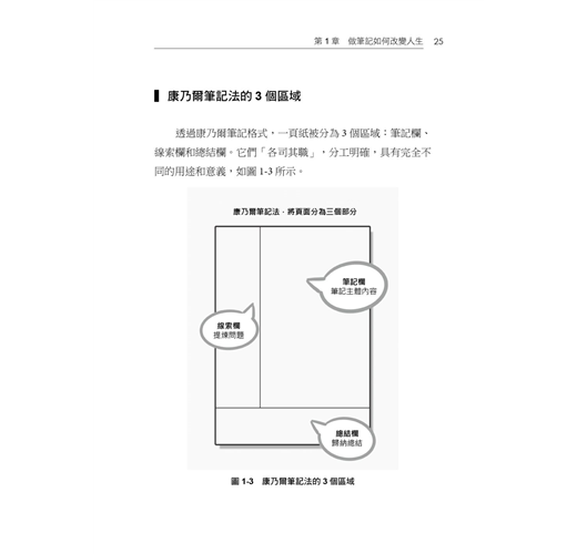 透過康乃爾筆記格式,一頁紙被分為3 個區域:筆記欄、線索欄和總結欄。它們「各司其職」,分工明確,具有完全不同的用途和意義,如圖1-3 所示。