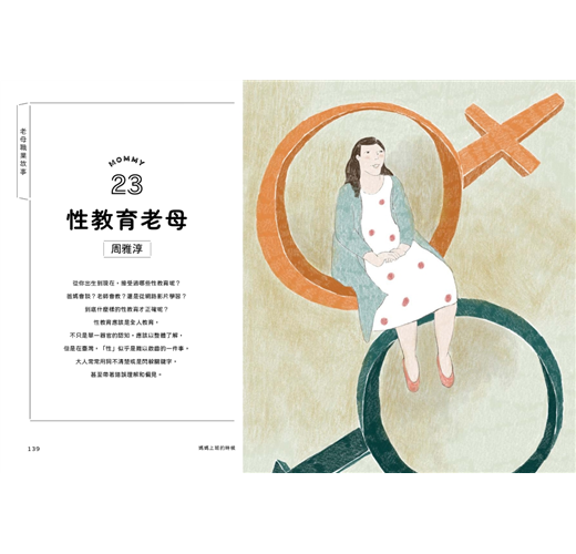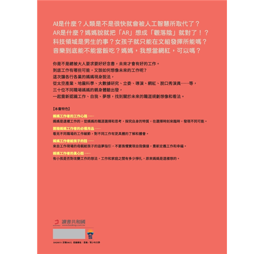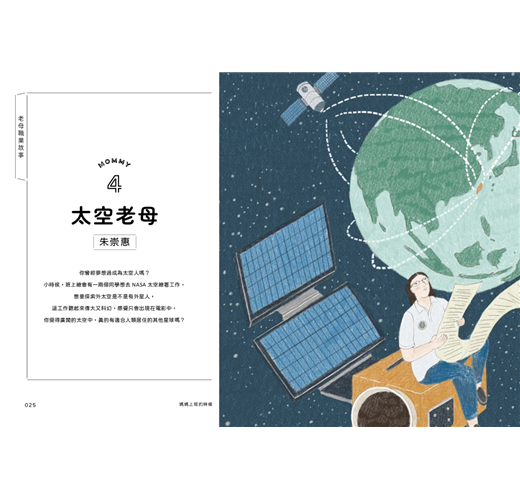 這次讓各行各業的媽媽現身說法,從太空、造船、地震科學、數據科學、立委、導演、網紅、脫口秀演員……等,三十位不同職場媽媽的親身體驗出發,一起重新認識工作、自我、夢想,對未來的職涯規劃有更多想像和看法。
