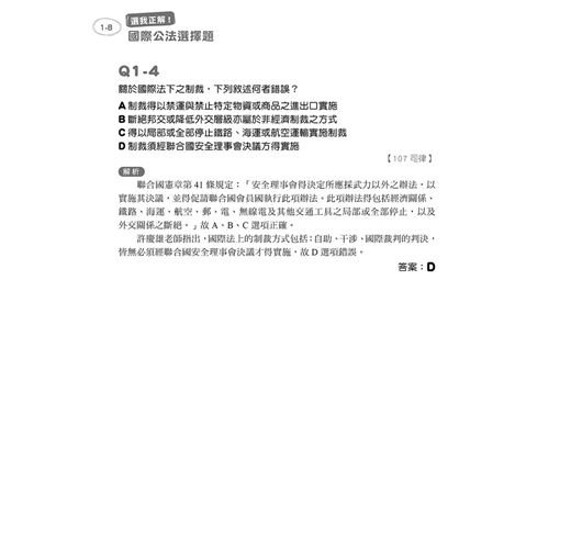 筆者累積十年國際法教學經驗,本書之編纂揉合補習班講義內容及考生需求,引註完整,說理清晰,並附大量精華提示,一看便懂。考題囊括民國100年至今所有國家考試類科的國際公法選擇題,收錄範圍廣泛,每題皆有詳細解析,祈讀者透過本書努力練習,於國家考試中輕鬆攻克國際公法!
