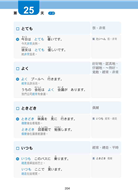 学習語彙は実際の過去問を参考にし、膨大なデータを分析することで、出題率の高い語彙720語を厳選しました。また、品詞ごとに提示することで、覚えやすさにも配慮が施されています。それぞれの語彙には、分かりやすく実用的な例文をそれぞれ用意し、なおかつN5で必要な文法をできるだけ用いることで、語彙力アップのみならず文法アップも目指せる一冊となっています。さらに、語彙によっては「似:意味が似ている語彙」、「反:意味が反対の語彙」、「延:関連語」などを提示することで、自然と語彙を増やすことができます。