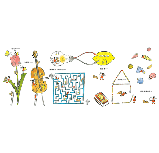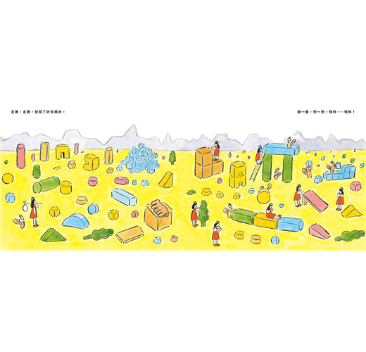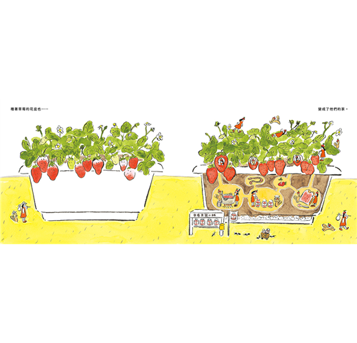 他們沿路看到許多東西,並化身小小建築師,將這些平凡的日常用品拿來蓋房子,像是森林或公園裡隨處可見的橡實、玩具箱裡的積木、雜貨店裡販賣的彈珠汽水、圖書館裡的故事書、花圃裡的草莓盆栽⋯⋯哇!甚至連鬱金香、小提琴、燈泡、檸檬、火柴棒和貝殼,也通通成了「家」的材料。
