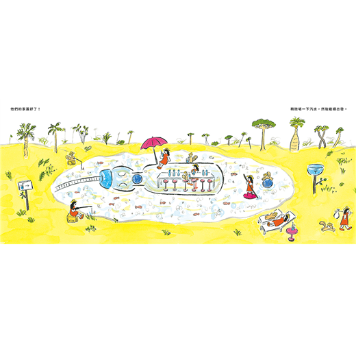 此外,畫面中還藏著許多小秘密,例如:小小人和松鼠在每個場景都戴著不同的帽子;汽水從瓶中倒出來變成小池塘後,沙漠中的植物也增加了;主角們回到最初的家後,窗戶上冒出了一根小芽!它會是誰的芽呢?小小人的行囊越來越大,裡面到底裝了些什麼?所有的秘密都將在最後一頁揭曉!