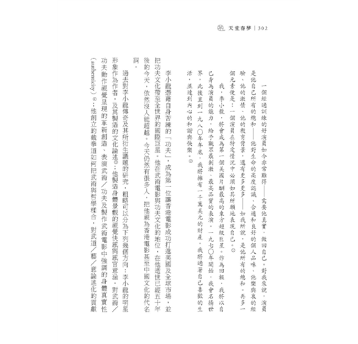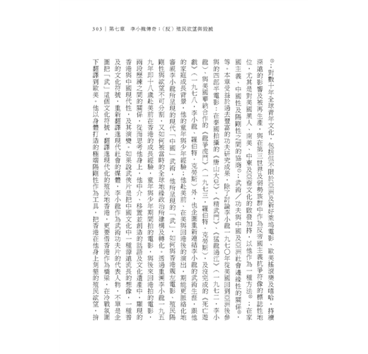 過去對李小龍傳奇及其所衍生議題的研究,粗略可以分為下列幾個方向:李小龍的明星形象作為作者,及其製造的文化論述;他製造身體景觀的視覺快感與感官意涵,對武術/功夫動作視覺呈現的革新創造、表演武術/功夫及製作武術電影中強調的身體真實性(authenticity);他創立的截拳道如何把武術與哲學糅合,對武道/藝/意論述化的貢獻;對數十年全球青年文化,包括但不限於亞洲及新好萊塢電影、歐美搖滾樂及嘻哈,持續深遠的影響及被再生產,與在第三世界及弱勢族群中作為反帝國主義抗爭符像的標誌性地位,尤其是對美國黑人、南美、中東及亞裔文化的啟發加持,以他作為一種方法;在家國主義、中國性及陽剛性之間的協商;武術/功夫與中國及亞洲社會邊緣性的關係,等。本章受益於過去豐富的功夫研究成果,除了討論李小龍一九七○年從美國回到亞洲後參與的四部半電影:在泰國拍攝的《唐山大兄》、《精武門》、《猛龍過江》(一九七二,李小龍)、與美國華納合作的《龍爭虎鬥》(一九七三,羅伯特.克勞斯),及沒完成的《死亡遊戲》(一九七八,李小龍、羅伯特.克勞斯)外,也企圖重新連結李小龍的武術生涯,跟他的家庭成長背景,他的童年與少年經驗;他赴美前、在美與回港後的演出,期能更脈絡化地審視李小龍所呈現的現代「中國」武術,他所呈現的「武」,如何與香港親左電影、殖民陽剛性與欲望不可分割,又如何被當時的全球地緣政治所建構及轉化。