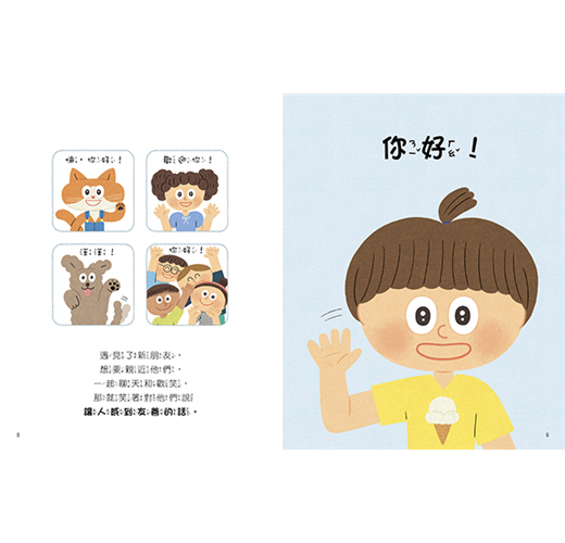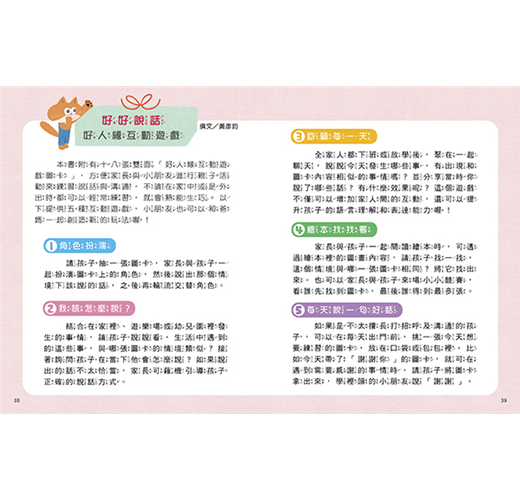 書中教的話語雖然看起來不難,但對於某些孩子來說,要說出口會有點害羞,因此家長除了一起閱讀繪本外,還可利用本書所附的「好人緣互動遊戲圖卡」來與孩子遊戲,逐步引導孩子習慣開口說這些日常中經常會使用的話語。當孩子能說出有禮貌、關懷他人的話,以及懂得用正確的話語來避免與人發生衝突,自然會得到其他人的喜愛,並與人有良好溝通,對人際關係有正面的影響。