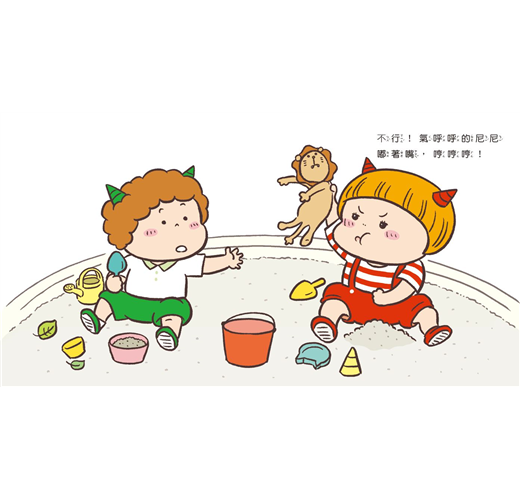 《借我啦!哼哼,尼尼才不要!》呈現小小孩和同儕互動的情境,藉由「搶玩具」這個常見的行為,陪伴孩子練習與人相處的能力。有趣的是,上恩看到尼尼不願意把心愛的小獅子玩偶借給朋友時,竟然拍了拍尼尼,大聲說著:「尼尼,不要這樣啦!」或許在托嬰中心曾遇過相似情況,讓她認為玩具應該跟朋友分享。當尼尼未經過朋友的同意,擅自「偷玩」別人的玩具,甚至闖了禍,朋友的即時救援也讓兩個娃娃找到和平相處的方式。故事中兩個娃娃的媽媽雖然只在畫面中出現三次,但其實她們一直坐在離孩子不遠處,觀察卻未介入孩子的衝突,在安全的前提下,等待孩子們找到解決問題的方法。一開始我並沒有注意到這兩位大人的存在,反而是上恩讀到故事中後段時,問了幾次:「媽媽咧?」我才意識到,在育兒的路途上,家長要學著放心、放手,不急著告訴孩子應該怎麼做,因為生命都有能力找到出口。