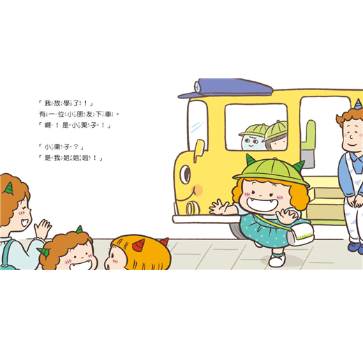 經過探訪幼兒園的鋪陳,終於來到《尼尼要上學!幼兒園的第一天》這天。我很喜歡故事裡不只呈現迫不及待想上學的尼尼,也畫出有些孩子第一天上學擔心害怕的心情,這才是真實的校園樣貌。活潑好動的尼尼來到新環境十分「用力」的探索,太過興奮的結果,不免和同學有些小擦撞,尼尼雖然哭得傷心,但也學了一次經驗,更在老師的痛痛咒語和大樹園長的假哭逗笑下,轉換情緒,在「元氣寶貝」的歌曲合唱中,度過哭哭笑笑的第一次上學。上恩最喜歡故事的尾聲,媽媽來接尼尼下課,尼尼即便看似在學校很勇敢,沒有一直哭著找媽媽,但下課後終於能投入媽媽的懷抱,眼角忍不住掛著眼淚,這完全說出上恩的心聲。每每到托嬰中心接她放學,隔著玻璃就能看見她指著窗外的媽媽,手舞足蹈的跳來跳去,媽媽終於來接我回家了。
