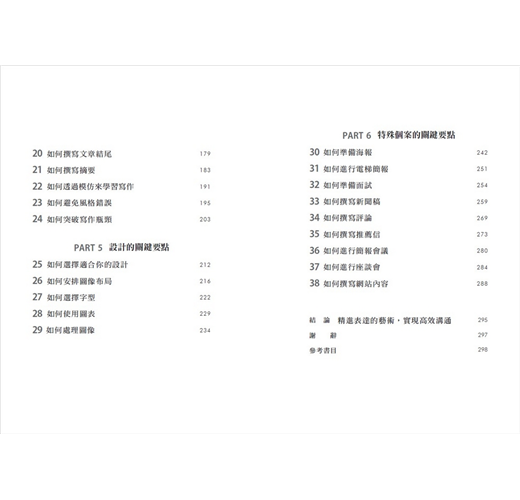 在本書前半部分,我會介紹表達的關鍵原則,讓你了解各種演講和寫作的共同要素。在後續篇章中,我會進一步深入討論演講、授課、寫作、設計,以及列舉特殊個案等主題。你最好讀完整本書,不過你可以先根據當前最需要解決的問題,開始閱讀相關章節。
