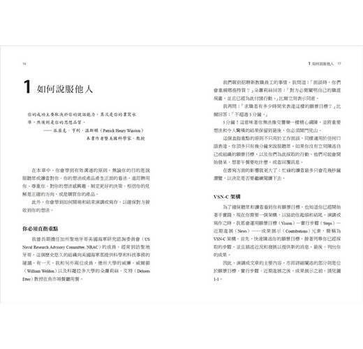 你會學到適用於各種形式的表達原則(包括口語或書面),即使你只運用本書提供的其中一種方法,人生也將因此產生改變,例如得到理想工作、贏得獎項、獲得訂單、達成銷售目標、說服老闆、獲取投資人信任、啟發學生,甚至展開一場變革。