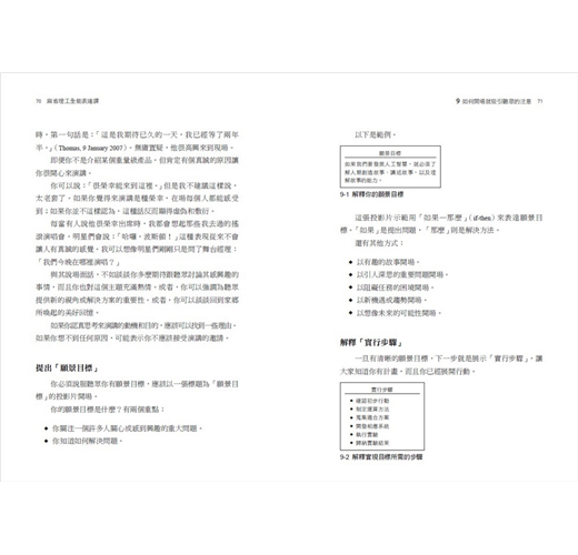 ◎演講:激勵人心的開場和結尾、吸睛的圖表和投影片、問答的策略、避免出錯的注意事項。