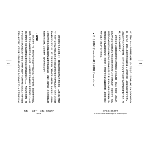 本書所提及的重要物理或科學概念包括:一、「多者異也」(More is Different,或「量變產生質變」),此為諾貝爾物理獎得主菲利普.沃倫.安德森(Philip Warren Anderson)於一九七二年所寫的文章,我可以稱之為「多體物理宣言」,這是本文提出複雜系統中出現新穎多體現象的根本原因。二、「普適性」與「普適類」:諸多不同複雜現象背後的共同規律(數學規律),包括以下兩種相關卻不完全相同的概念:1、「普適性」(universality):鳥類集體飛行、磁性材料、腦神經細胞元……這些看似完全無關的系統之間卻存在著「共通性」原理(或基於「幾乎一樣」的數學模型)。2、「普適類」(universality class):不同的多體物理系統在相變臨界點附近所展現的「同一種」臨界行為。三、不同科學領域間存在著以滿足同一個數學結構作為「隱喻」及「類比」關係的「相似性」。四、於正式論文裡常被忽略不提的「直覺推理」,卻在取得重要科學成果的過程中,扮演最關鍵的角色。