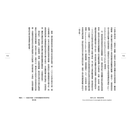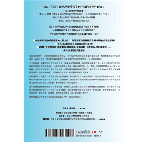 愛因斯坦曾說,「21世紀是複雜科學的世紀」。本書是帕里西為一般讀者所寫,罕見用優雅簡潔的論述方式,解開複雜系統的內涵與真相,思想深刻、風趣幽默、深入淺出,忠實呈現並反思自己獲得諾貝爾獎關鍵性成果背後的研究經歷與教訓,令人驚奇且愉快。