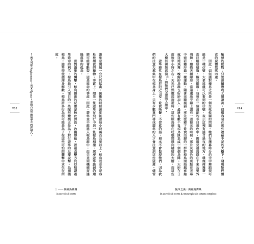 帕里西將科學實踐從實驗室中移出,來到椋鳥群飛的現場。冬天的羅馬,無數椋鳥有節奏地迴旋飛舞,遮蔽天空,就像有個樂隊指揮——這樣複雜的集體行為,是如何做到的?帕里西觀察鳥群的飛行、設計實驗、重建單個標本在空間和時間上的軌跡、建立3D圖像、深化技術操作、自承失敗重新設計……,最終,鳥群的飛行為複雜系統提供了一種啟發性的規則——包括從原子和行星到其他動物;許多不同的、看似毫無關聯的現象,例如大腦網絡、人際關係等,都可以用這種新的模式理解。