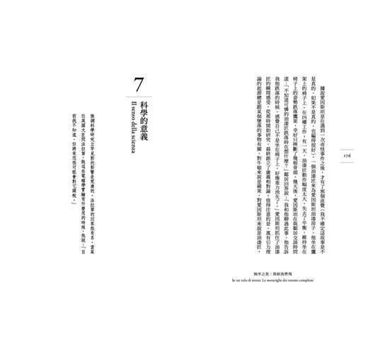 本書是二○二一年諾貝爾物理獎得主喬治.帕里西自傳式的科普著作,他以自身經驗談論存在於不同科學領域中,有關複雜系統現象的研究及其共通性(普適性規律),包括對鳥類集體飛行的理解、在隨機摻雜磁性金屬雜質之合金中出現的「自旋玻璃」態理論的建構(這是他獲得諾貝爾物理獎的主要原因)、磁性物質中因溫度上升而產生從有磁性到無磁性的相變(物質狀態改變)與臨界現象等;並以生動活潑的例子,說明科學研究的曲折過程,例如如何克服困難、如何面對質疑、成功與失敗的研究經驗、不同研究領域間基於隱喻類比關係的交流、科學家研究的靈感來源為何、科學在現代科技社會中的意義與價值等。目的是希望能重新喚起社會對科學的信任,並以科學的態度因應人類社會當前的巨大挑戰,例如地球暖化、蔓延全球的瘟疫等種種危機。