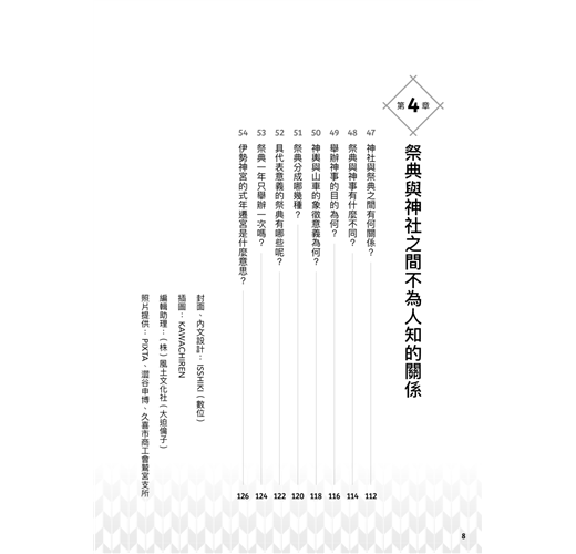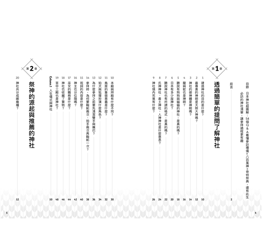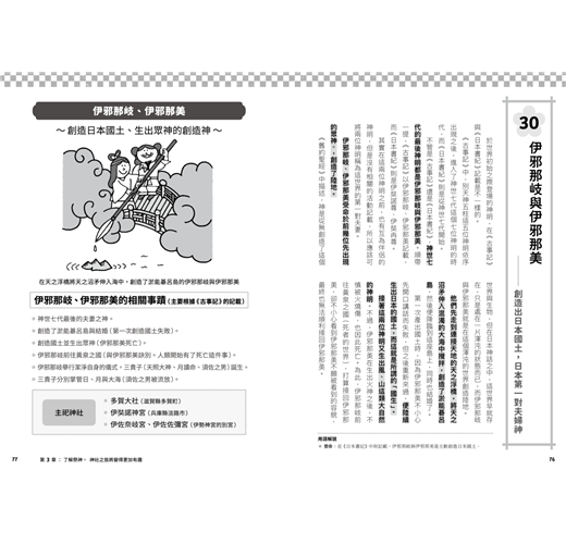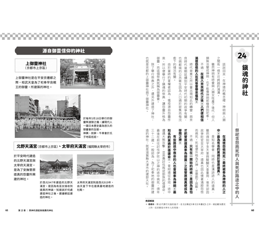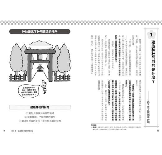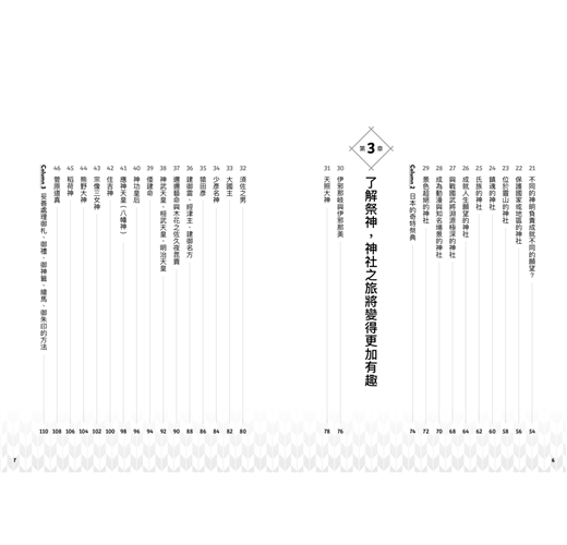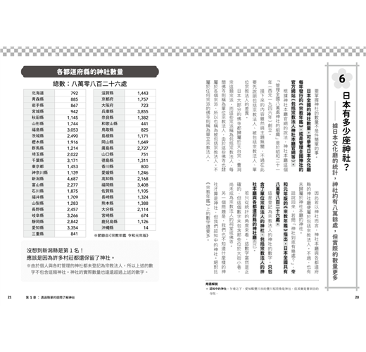 包含神社分類、祭神傳說、奇特祭典、神寶等,以一問一答QA形式將繁雜綿長的日本神祇傳說,轉為趣味盎然的典故知識,千里迢迢去日本看神社,不再只是一知半解胡亂參拜,而能幫助你找到實現願望的神社、祈求姻緣、長壽的神社、帶來財富的神社等,或是一訪成為動漫聖地的神社、此生必訪的神社,從簡單問答到神社起源、祭神傳說、祭典儀式,紮紮實實的信仰珍寶,全數濃縮在本書之中。