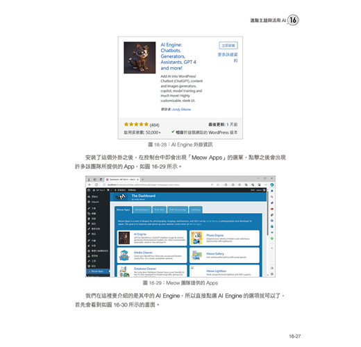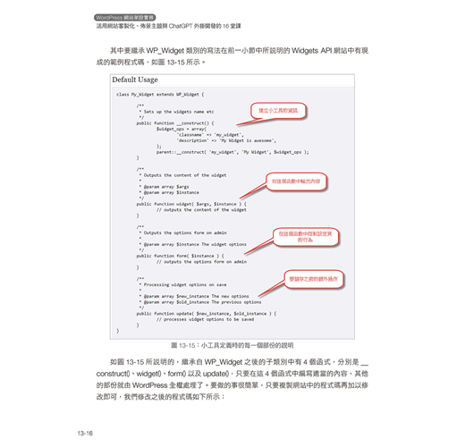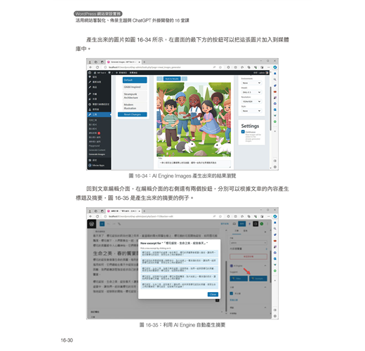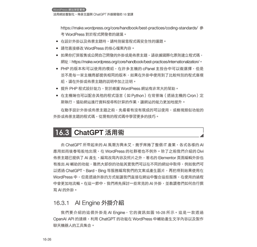 透過累積的程式設計經驗,學習用PHP程式碼為網站增加功能,設計出許多實用的外掛和小工具。此外,也以實例來學習利用自定義文章型態,建立具有更強大功能的外掛。最後提出維護WordPress網站的重要知識技能,並介紹AI在WordPress上的應用,以及製作具備AI功能的外掛。