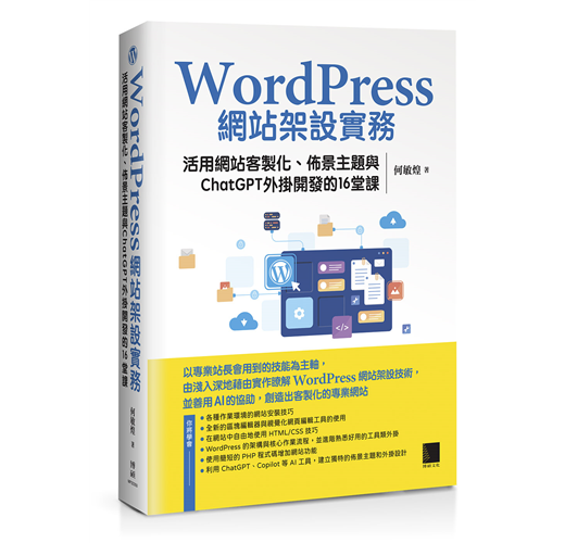 從介紹佈景主題的基礎知識及學習視覺化網頁編輯器開始,並學習簡要的PHP程式設計技巧,打下自訂佈景主題的能力。同時會教讀者如何從無到有,透過好用的工具建立全新的佈景主題,以及說明如何在Visual Studio Code中善用Copilot協助佈景主題的開發工作。