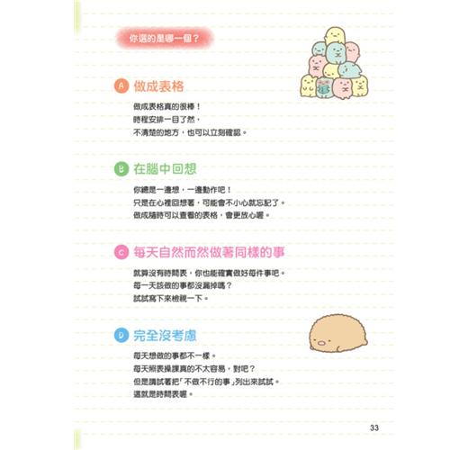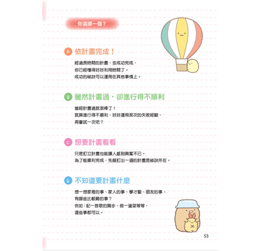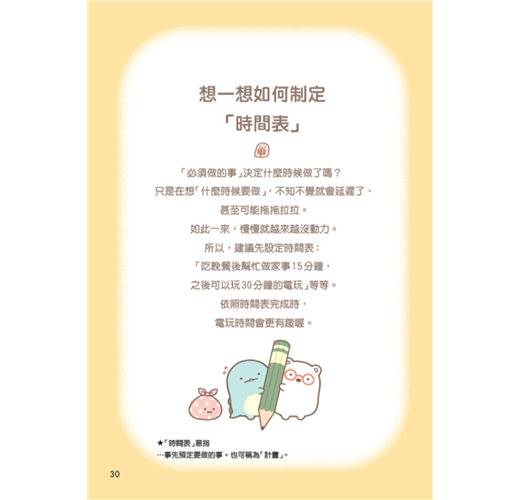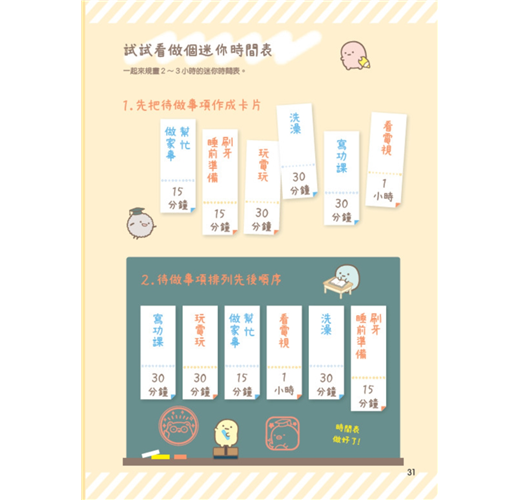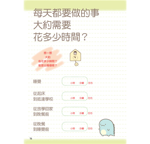 每章後面都附有時間管理做做看的練習,不但教給孩子時間管理的方法和妙招,也透過循序漸進的練習,讓孩子建立起管理時間的意識,快速掌握技巧,還能培養良好的習慣,讓孩子學會合理安排學習和生活!