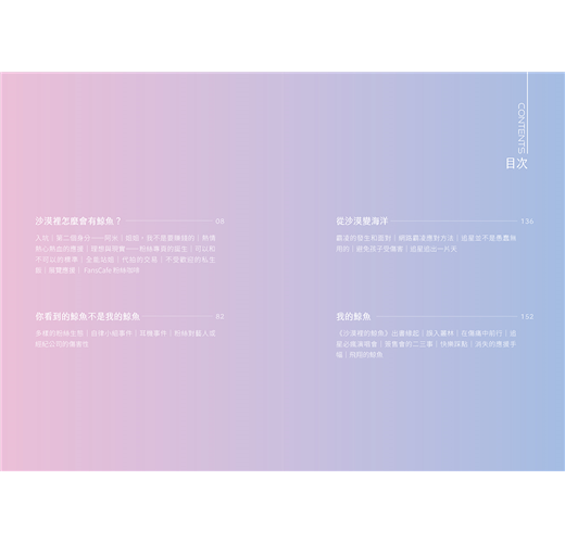 入坑|第二個身分——阿米|姐姐,我不是要賺錢的|熱情熱心熱血的應援|理想與現實——粉絲專頁的誕生|可以和不可以的標準|全能站姐|代拍的交易|不受歡迎的私生飯|展覽應援| FansCafe 粉絲咖啡