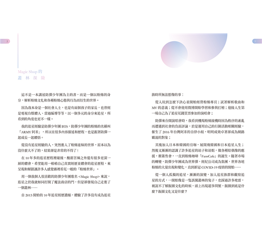 這不是一本講述防彈少年團為主的書,而是一個以粉絲的身分,解析粉絲文化和各種粉絲心態與行為而衍生的世界。