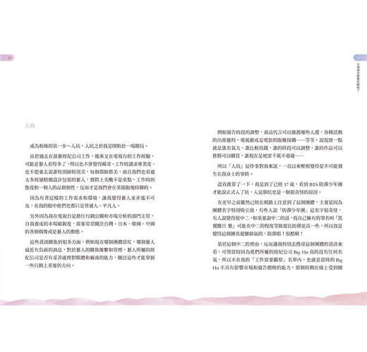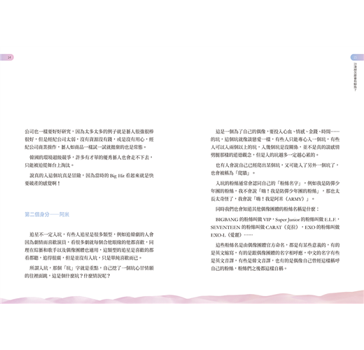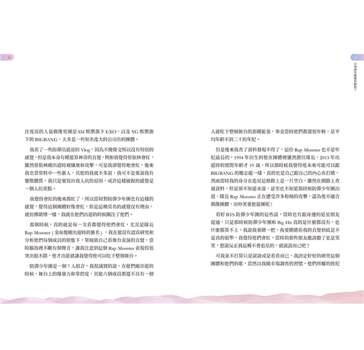 作者以一個多元的身分來追星,所看到的角度也更不一樣。除了分享自己的經驗和體驗之外,也希望能夠對社會和粉絲提供有助益價值的內容。