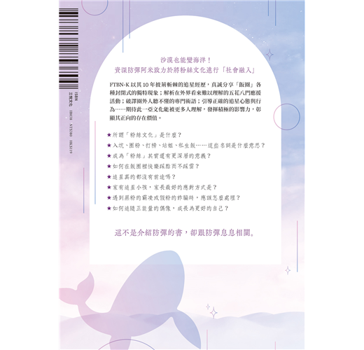 資深阿米FTBN-K致力於將粉絲文化進行「社會融入」,以其10年披荊斬棘的追星經歷,真誠分享「飯圈」各種封閉式的獨特現象;解析在外界看來難以理解的五花八門應援活動;破譯圈外人聽不懂的專門術語;引導正確的追星心態與行為……期待此一亞文化能被更多人理解,發揮積極的影響力,彰顯其正向的存在價值。