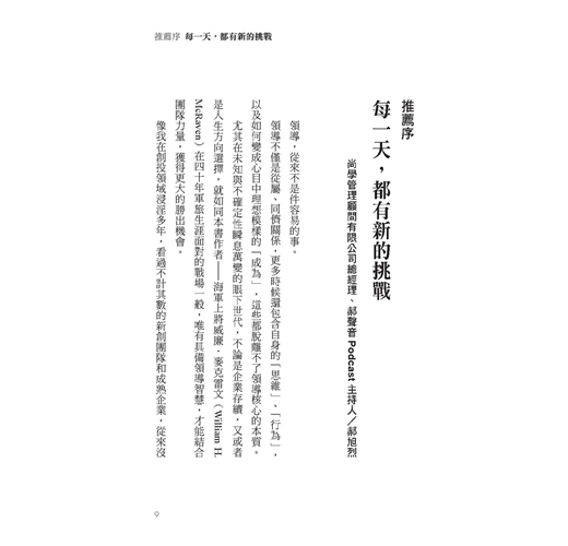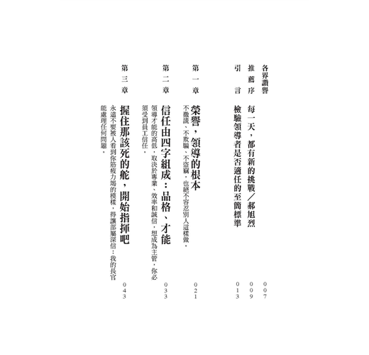 相信「以身作則、超越期待、與時俱進」以及書中18則名言,和引人入勝的故事,都可以在我們增進領導智慧的道路上,多點上一盞明燈。