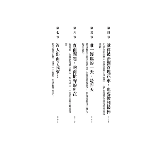 <就算被派到管理花車,也要做到最棒>一篇,就是作者想特別強調:不分大小事,都要竭盡全力做到最好。不僅僅是因為魔鬼都藏在細節裡,更重要的關鍵,是這種超越期待的「習慣」才更有機會勝出。因為所有成功,都不是單一事件造成,而是集合眾人力量才能成就的事物。
