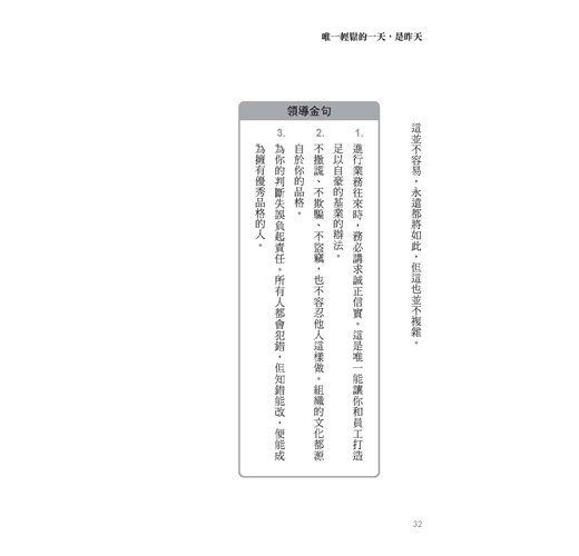 在本書中,我從這些名言精選了18則,它們是我職涯的指路明燈──這些格言、信條、寓言與故事,在我接受新任務或面臨特別艱難的領導挑戰時,都曾帶來正面助益。