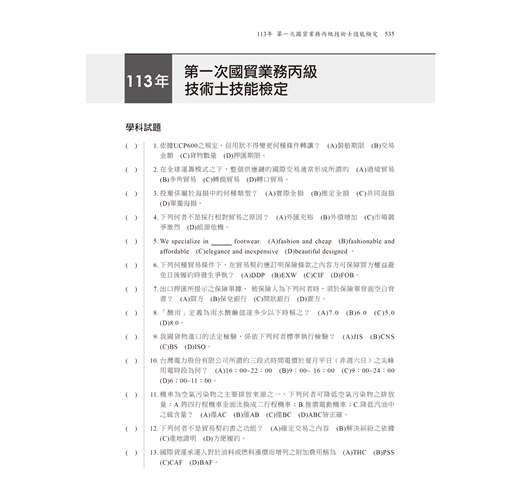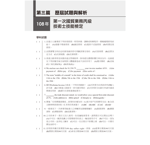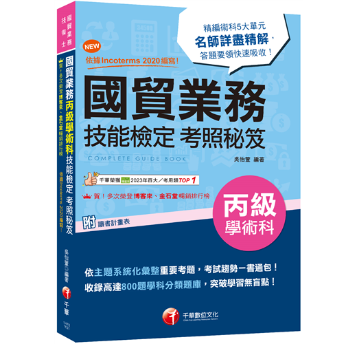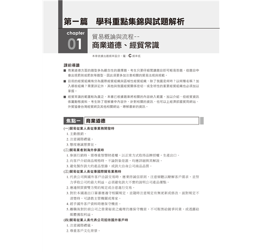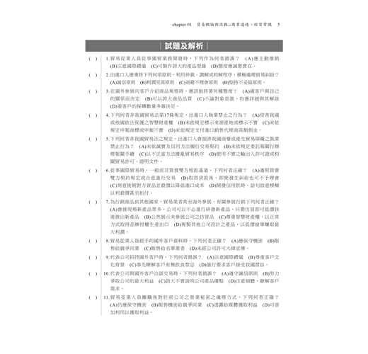 練習題目是驗收自己是否吸收的一個很好的方式,所以本書在每個重點後面,均附有相關的練習題,屬於小範圍的單元練習,藉此可以慢慢累積解題的方法、速度等,對於考試很有幫助。另外在讀完個個篇章後,再搭配本書收錄歷屆試題與解析,更有助於了解最近幾年的命題重點,在國貿業務丙級技術士專業的路上,可獲得事半功倍之效。
