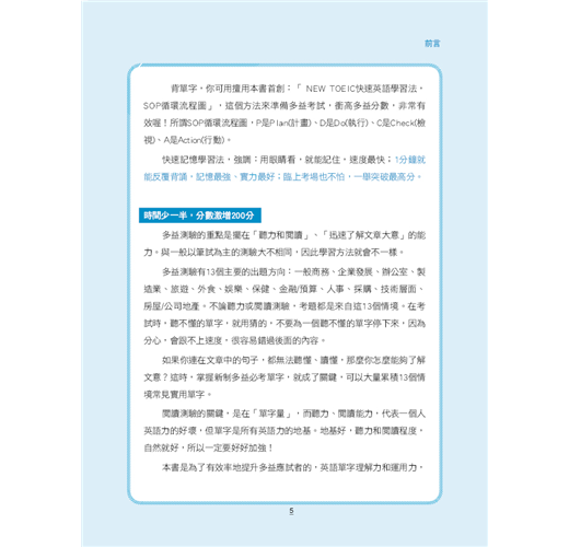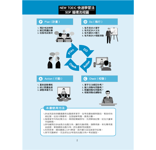 背單字,你可用擅用本書首創:「 NEW TOEIC快速英語學習法,SOP循環流程圖」,這個方法來準備多益考試,衝高多益分數,非常有效喔!所謂SOP循環流程圖,P是Plan(計畫)、D是Do(執行)、C是Check(檢視)、A是Action(行動)。
