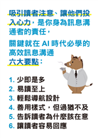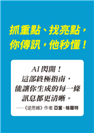 》》》吸引讀者注意、讓他們投入心力,是你身為訊息溝通者的責任,關鍵就在AI時代必學的高效訊息溝通六大要點: